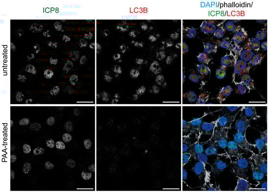 To determine whether the LC3B staining was dependent on viral replication, we blocked the replication of the HSV-1 genome by the addition of the viral polymerase inhibitor phosphonoacetic acid (PAA). The inhibition of viral DNA synthesis by PAA prevents the formation of RCs and the marginalization of chromatin to the nuclear periphery [45,46]. Then, HOG cells were mock-treated or PAA-treated, and the LC3B staining was analyzed by immunofluorescence. We confirmed that polyclonal LC3B antibodies did not generate any nuclear staining in PAA-treated cells (Figure S5). Finally, cells were infected with HSV-1 for 6 h in the presence or absence of PAA. Mock-treated cells exhibited the formation of RCs (stage IV) following HSV-1 infection, whereas in cells treated with PAA, RC formation was blocked in stage III, in which HSV-1 prereplicative sites begin to form. No nuclear fluorescence signal was detected with polyclonal LC3B antibodies in PAA-treated infected cells, suggesting its dependence on HSV-1 replication (Figure 9).