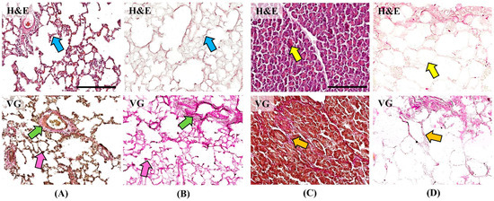 Histological examination using hematoxylin and eosin (H&E) staining demonstrated alveolar architecture of the lung and acinar architecture of the pancreas without pathological changes (Figure 2). No cells or residual cellular detritus were detected in the matrices after the decellularization procedure (Figure 2B,D blue and yellow arrows). Van Gieson (VG) staining demonstrates the structure of collagen fibers of the ECM, which take on a bright pink color. Collagen fibers form the base of the alveolar septa (pink arrows), vascular and bronchial walls (green arrows) of the lung, and are preserved in the DCL matrix (Figure 2A,B). In the pancreas, collagen fibers make up thin interacinar septa and thicker interlobular septa (orange arrows), which are also preserved in the DCL matrix (Figure 2C,D). Preservation of the native collagen structure during histological examination confirms the stability and structural integrity of the DCL matrices.