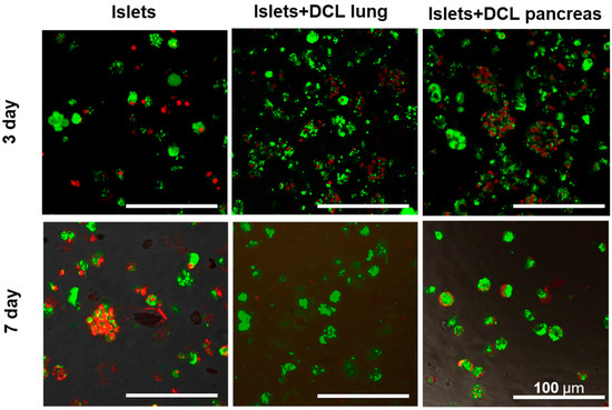 Fluorescence microscopy of islets of Langerhans, islets on DCL lung, islets on DCL pancreas (left to the right) on 3 and 7 days of culture Live/Dead staining Calcein AM (green) and propidium iodide (red) (scale bar 100 μm).
