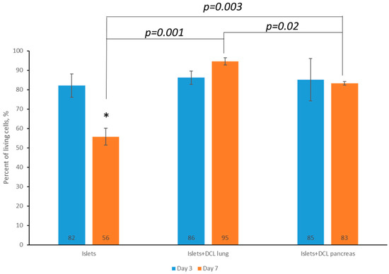 Percentage of living islets of Langerhans without matrices on DCL lung and DCL pancreas on the 3rd and 7th days, (Mean ± SD, *—p < 0.05).