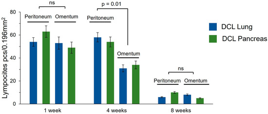 Lymphocyte density (pcs/0.196 mm2) in the area of matrix implantation into the peritoneum and omentum. ns—nonsignificant (p ≥ 0.05).