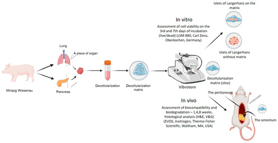 - Berkova, Z.; Zacharovova, K.; Patikova, A.; Leontovyc, I.; Hladikova, Z.; Cerveny, D.; Tihlarikova, E.; Nedela, V.; Girman, P.; Jirak, D. Decellularized Pancreatic Tail as Matrix for Pancreatic Islet Transplantation into the Greater Omentum in Rats. J. Funct. Biomater. 2022, 13, 171. [Google Scholar] [CrossRef]