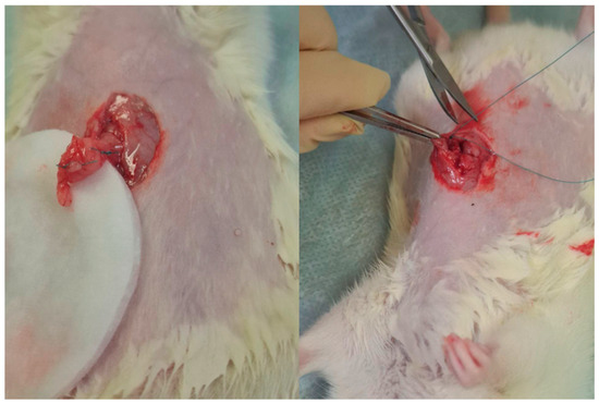 To assess biodegradation and biocompatibility, decellularized lung and pancreatic matrices (5 μm slices) were transplanted into two sites in the Wistar rats: the omentum (selected for its high vascularization and growth factor secretion [CXCR4, VEGF and SDF-1]) and the peritoneum (a standard transplantation site) [17]. Prior to surgical implantation, the animals were anesthetized with Zoletil (6 mg/kg) and xylazine (90 mg/kg). The matrices were positioned in both sites through 0.5–0.7 cm abdominal incisions, followed by layered closure (Figure 8).