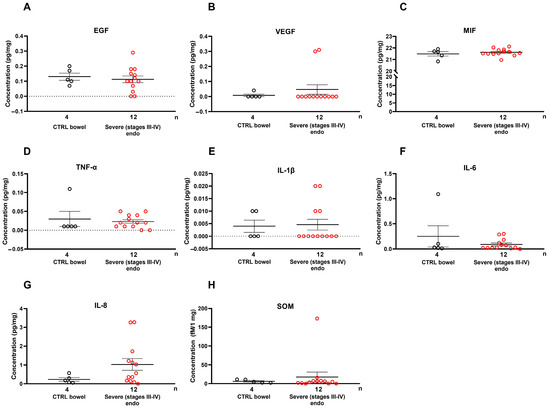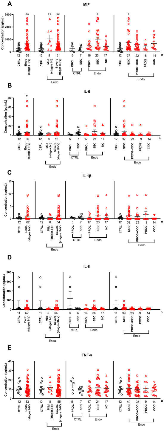 - Bergqvist, A.; Bruse, C.; Carlberg, M.; Carlström, K. Interleukin 1β, interleukin-6, and tumor necrosis factor-α in endometriotic tissue and in endometrium. Fertil. Steril. 2001, 75, 489–495. [Google Scholar] [CrossRef]