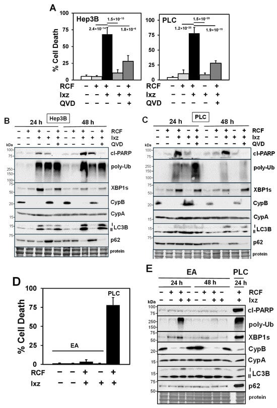 The RCF + Ixz combination enhances apoptotic cell death in HCC cells but not in non-cancer cells. (A) The trypan blue exclusion assay showed significantly higher cell death in RCF (5 μM) + Ixz (15 nM; 2238)-treated Hep3B and PLC cells (72 h) compared to RCF-, Ixz-, and control-treated cells. The addition of the apoptosis inhibitor QVD (10 μM) significantly decreased the RCF + Ixz-induced death of Hep3B and PLC cells. p values are shown near the bars. (B,C) Western blot analyses showed higher cl-PARP, XBP1s, and LC3B levels in RCF + Ixz-treated Hep3B (B) and PLC (C) cells (24 and 48 h) compared to RCF-, Ixz-, and control-treated cells. Poly-Ub levels were higher in cells treated with RCF + Ixz (48 h,) and CypB levels decreased with RCF and RCF + Ixz treatment (24 and 48 h). The decreased p62 levels observed with RCF + Ixz (48 h) suggest increased autophagy. No changes were noted in CypA levels. The addition of QVD to RCF + Ixz only decreased cl-PARP levels. (D) The trypan blue exclusion assay showed that RCF (5 μM) + Ixz (15 nM) slightly increased cell death in non-cancer EA cells (3.6%) compared to PLC HCC cells (78%). (E) Western blot analyses showed that RCF + Ixz only slightly increased cl-PARP, XBP1s, and LC3B levels in EA cells, unlike the greater increases in PLC HCC cells. In EA cells, there was an increase in poly-Ub levels (24 h) and decrease in CypB levels, but no clear differences in CypA levels. For all Western blots, the size of molecular weight markers in kDa are shown to the left. Protein refers to Coomassie blue staining after all immunological analyses were completed.