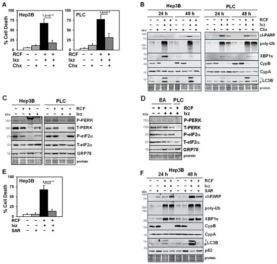 The protein synthesis inhibitor cycloheximide (Chx) and autophagy inhibitor SAR405 block the RCF + Ixz-induced death of HCC cells. (A) The trypan blue exclusion assay showed that the addition of Chx (10 μM Hep3B; 1 μM PLC) to RCF (5 μM) + Ixz (15 nM) significantly decreased the death (72 h) of Hep3B and PLC cells. p values are shown above the bars. (B) Western blot analyses showed that the addition of Chx decreased cl-PARP, poly-Ub, XBP1s, and LC3B levels in RCF + Ixz-treated Hep3B and PLC cells. No differences were noted in CypA or B levels. (C) Western blot analyses showed that RCF + Ixz decreased total (T)-PERK and P-eIF2α levels to greater extent than in RCF-, Ixz- or control-treated Hep3B and PLC cells, suggesting that the mechanism to decrease protein synthesis to better recover from proteotoxic stress was blocked. No clear differences in T-eIF2α or GRP78 levels were noted. (D) Unlike in HCC cells, RCF + Ixz did not decrease PERK or P-eIF2α levels in EA non-cancer cells. There was a small increase in GRP78 levels. (E) The trypan blue exclusion assay showed that the addition of SAR (2.5 μM) to RCF (5 μM) + Ixz (15 nM) significantly decreased the death of Hep3B cells (p value shown above the bar). (F) Western blot analyses showed that SAR decreased cl-PARP and LC3B levels and increased p62 levels (suggesting inhibition of autophagy) in RCF + Ixz-treated Hep3B cells (48 h). SAR decreased the RCF + Ixz-induced increase in XBP1s levels (24 h) but there were no clear differences in poly-Ub, CypA, or B levels. For all Western blots, the sizes of molecular weight markers in kDa are shown to the left. Protein refers to Coomassie blue staining after all immunological analyses were completed.
