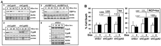Inducible knockdown indicates that CypA and CypB are pro-survival proteins whereas XBP1s is a pro-survival protein early but pro-death protein later in RCF + Ixz-treated Hep3B HCC cells. (A) Western blot analyses of (1) Hep3B/shCypA-1, -2; (2) Hep3B/shCypB-1, -2; and (3) Hep3B/shXBP1s-2, -3 cells treated with Dox (100 ng/mL) for 24, 48, and 72 h. The results showed decreased CypA (1), CypB (2), and XBP1s (3) levels compared to control cells; no effect on actin levels was noted. Dox treatment of Hep3B/shScr negative control cells (4) showed no clear differences in CypA, CypB, XBP1s, or actin levels (same blot). Sizes of the molecular weight markers in kDa are shown to the left. Protein refers to Coomassie blue staining after all immunological analyses were completed. (B–D) Trypan blue exclusion assays showed that the addition of Dox (+) to induce knockdown of CypA (B) increased Ixz- (2238; 25 nM) (72 h) and RCF (5 μM) + Ixz (25 nM)-induced (27 h) cell death in Hep3B/shCypA-1 and -2 cells. The addition of Dox to induce the knockdown of CypB (C) increased cell death in Ixz- but not in RCF + Ixz-treated Hep3B/shCypB-1 and -2 cells. The addition of Dox to induce the knockdown of XBP1s (D) at time 0 h increased cell death in RCF + Ixz-treated Hep3B/shXBP1s-2 and -3 cells (27 h). However, the addition of Dox 24 h after RCF + Ixz decreased cell death after another 24 h. In all cases, the addition of Dox to Hep3B/shScr negative control cells did not result in differences in cell death. In addition, no Dox (−) cell death was similar to Scr negative control cells. In the shorter RCF + Ixz (27 h) treatments, cells were pretreated with Dox for 48 h. p values are shown above the bars.