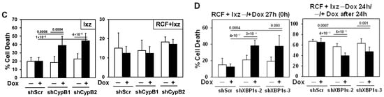 To determine the roles of CypA, CypB, and XBP1s in mediating the RCF + Ixz-induced death of Hep3B and PLC cells, we developed a doxycycline (Dox)-inducible lentivirus shRNA knockdown system (Figure 3A and Figure S7). The results indicated that the inducible knockdown of CypA increased the Ixz- and RCF + Ixz-induced death of Hep3B and PLC cells (Figure 3B and Figure S8A), suggesting a pro-survival role for CypA. Inducible knockdown of CypB increased Ixz-induced cell death but not RCF + Ixz-induced cell death (Figure 3C and Figure S8B). We suggest that since CypB levels were already decreased by RCF + Ixz, further knockdown would not have an effect. However, knockdown of CypB (mimics the RCF effect) and Ixz treatment did result in increased cell death, suggesting a pro-survival role for CypB.