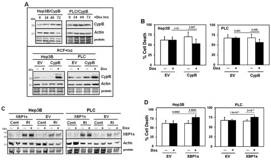 Inducible expression of CypB decreases and XBP1s increases cell death in RCF + Ixz-treated HCC cells. (A) Western blot analyses showed that the addition of Dox (24, 48, and 72 h) increased CypB levels but not actin levels in Hep3B/CypB and PLC/CypB cells compared to no Dox (0 h) (top panel). Bottom panel: the addition of Dox (+) increased CypB levels in RCF + Ixz (72 h)-treated Hep3B/CypB and PLC/CypB cells compared to empty vector (EV) negative controls and no Dox (−). No changes in actin levels were noted. (B) The trypan blue exclusion assay showed that the addition of Dox (+) to increase CypB levels decreased cell death in RCF (5 μM) + Ixz (15 nM) (72 h)-treated Hep3B/CypB and PLC/CypB cells compared to EV negative controls and no Dox (−). p values are shown above the bars. (C) Western blot analyses showed that the addition of Dox (+) slightly increased XBP1s levels only in RCF + Ixz (RI)-treated Hep3B/XBP1s and PLC/XBP1s cells compared to EV negative controls and actin. Control (Cont) DMSO-treated EV and XBP1s cells had very low levels of XBP1s −/+Dox. (D) The trypan blue exclusion assay showed that the addition of Dox (+) to induce XBP1s expression increased cell death in RCF + Ixz (72 h)-treated Hep3B/XBP1s and PLC/XBP1s cells compared to EV negative controls and no Dox (−). p values are shown above the bars. In (A) and (C), the sizes of molecular weight markers in kDa are shown to the left. Protein refers to Coomassie blue staining after all immunological analyses were completed.