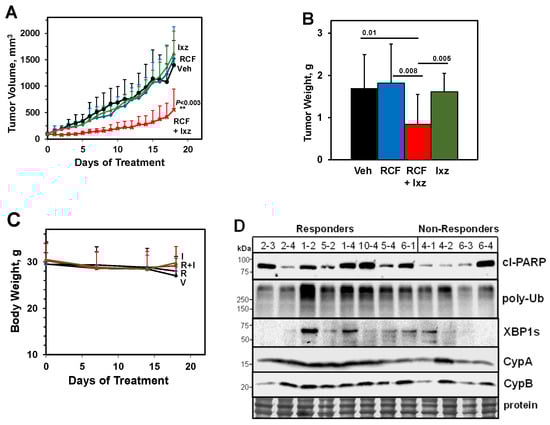 RCF + Ixz inhibit tumors in mice with Hep3B xenografts. (A) RCF (80 mg/kg, daily) + Ixz (5 mg/kg, 2 days on/1 day off × 6) significantly reduced the tumor volumes of Hep3B xenografts compared to RCF-, Ixz-, and vehicle (Veh) control-treated mice (**, p < 0.003). (B) Final tumor weights were significantly less after RCF + Ixz treatment compared to the RCF, Ixz, and Veh treatments (p values shown above bars). (C) No significant changes in body weights were observed in RCF + Ixz (RI)-, RCF (R)-, Ixz (I)-, and Veh (V)-treated mice. (D) Western blot analysis of Hep3B tumors in the RCF + Ixz group separated into responders (final tumor volume [mm3]; final tumor weight [g]) 2-3 [331; 0.43], 2-4 [403; 0.47], 1-2 [132; 0.28], 5-2 [669; 0.42], 1-4 [225; 0.37], 10-4 [221; 0.31], 5-4 [162; 0.39], 6-1 [486; 0.74] and non-responders 4-1 [912; 2.13], 4-2 [557; 1.13], 6-3 [774; 1.22], 6-4 [1368; 2.44]. Although there was variability between responders and non-responders, the results showed that responders had slightly increased cl-PARP, poly-Ub, and XBP1s levels compared to non-responders. No clear differences were noted in CypA/B levels.