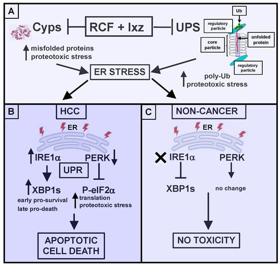 Schematic diagram of the pro-cell death effect of RCF + Ixz on HCC cells but not on non-cancer cells. (A) The combination of RCF (reduces CypB levels, inhibits CypA and other Cyp family members, resulting in increased levels of misfolded proteins and proteotoxic stress) + Ixz (blocks the UPS to increase poly-Ub levels and proteotoxic stress) amplifies ER stress. A reduction in CypB levels and increase in poly-Ub levels occur in cancer and non-cancer cells. (B) In HCC, RCF + Ixz activates the IRE1α/XBP1s UPR pathway, resulting in an early pro-survival effect. RCF + Ixz maintains XBP1s expression at later times, resulting in a pro-death effect. RCF + Ixz also decreases PERK levels, thus preventing P-eIFα from stopping further protein synthesis, resulting in a further enhancement of proteotoxic stress. The overall effect is to increase apoptotic cell death. (C) In non-cancer cells, even though RCF + Ixz increased poly-Ub levels and decreased CypB levels, there was no effect on IRE1α/XBP1s levels and the PERK UPR pathway, resulting in no cell death or toxicity.