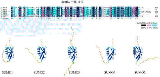In humans, five SUMO homologous genes have been identified: SUMO1, SUMO2, SUMO3, SUMO4, and SUMO5 []. Structurally, SUMOs share a high degree of similarity with ubiquitin, as depicted in Figure 1, where the blue region of the SUMO three-dimensional structure represents the ubiquitin-like domain. SUMO1, the first identified member of the SUMO family, primarily functions under normal physiological conditions, modifying proteins involved in routine biological activities []. SUMO2 and SUMO3 share 96% sequence homology and are predominantly activated during cellular stress [,,,]. These two isoforms often form poly-SUMO chains, which participate in stress response pathways. SUMO4 and SUMO5, the most recently identified members of the SUMO family, remain less well-studied. SUMO4 is encoded by the human TAB2 gene and resembles SUMO2/3 in both structure and function, with the 90th amino acid in SUMO4 being proline instead of glutamine, potentially affecting its function []. SUMO5, the latest addition to the SUMO family, is associated with the assembly and disassembly of promyelocytic leukemia nuclear bodies (PML-NBs) [].