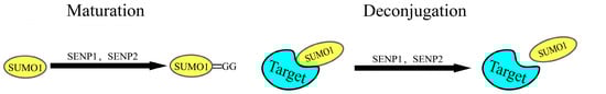 Proteins are the primary executors of biological activities, and their proper functioning ensures that these activities proceed efficiently. Post-translational modifications (PTMs) play crucial roles in maintaining protein function. To date, over 20 types of PTMs have been identified, including phosphorylation, acetylation, methylation, glycosylation, ubiquitination, and SUMOylation. Among these PTMs, SUMOylation is particularly important due to its roles in modulating protein subcellular localization and protein–protein interactions. In addition, SUMOylation is integral to various biological processes, including chromatin remodeling, DNA repair, transcription regulation, and cell cycle progression, underscoring Its critical role in maintaining cellular homeostasis [].