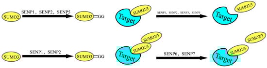 SUMOylation is a reversible post-translational modification mediated by a conserved enzymatic cascade that shares mechanistic parallels with, but diverges functionally from, the ubiquitin conjugation pathway. This process involves the coordinated action of SUMO-specific enzymes, including E1 activating enzymes, E2 conjugating enzymes, E3 ligases, and sentrin-specific proteases (SENPs) []. The most studied SUMO-specific enzymes are the SENP (sentrin-specific protease) family, which includes SENP1, SENP2, SENP3, SENP5, SENP6, SENP7, and SENP8 [,]; however, SENP8 does not act on SUMO []. SUMOylation is a reversible process consisting of the following five steps, as illustrated in Figure 2: maturation, activation, conjugation, ligation, and de-modification. At the start of the SUMO cycle, SUMO exists as an inactive precursor that requires SENPs to cleave its C-terminal tail, exposing the terminal Gly-Gly (GG) motif. SENPs also play a crucial role in the dissociation of SUMO from the target protein. Different types of SENPs interact with various SUMO isoforms, as illustrated in Figure 3. SENP6 and SENP7 exhibit the activity to dissociate poly-SUMO2/3 chains []. The E1 activating enzyme is typically a dimer composed of SUMO-Activating Enzyme 1(SAE1) and SUMO-Activating Enzyme 2 (SAE2), with SUMO molecules often binding to SAE2; currently, the only reported E2 conjugating enzyme is Ubiquitin Conjugating Enzyme 9 (UBC9). In contrast, the diversity of E3 ligases depends on the specific substrates, enhancing the substrate specificity of the modification process [,,].