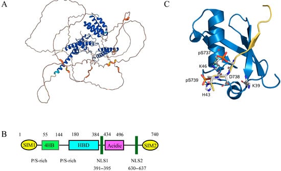 SUMOs are a class of protein post-translational modifiers similar in structure to ubiquitin (Ub). To date, more than 6000 proteins, primarily nuclear proteins, have been identified as target proteins of SUMOylation []. SUMOylation is a reversible process in which the C-terminus of SUMO covalently binds to a lysine (Lys) residue on the target protein [,]. Unlike ubiquitination, SUMOylation does not promote protein degradation but instead stabilizes target proteins and modulates their functions [,].