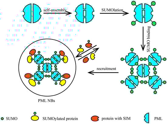 The assembly of PML NBs begins with the aggregation of PML protein. PML self-aggregates through the oxidation of its cysteine residues by reactive oxygen species (ROS), forming disulfide bonds and engaging in non-covalent interactions via its RING finger, B-box, and coiled-coil (RBCC) domain. Studies indicate that specific PML isoforms may also participate in the initial steps of PML assembly. The second step involves the SUMOylation of PML protein. PML NBs are rich in the SUMO E2 conjugating enzyme UBC9, which mediates the SUMOylation of PML and other proteins within PML NBs []. Finally, PML recruits SUMO-modified proteins and proteins containing SIMs to the core structure composed by PML, utilizing its own SIM and SUMOylation [,,,,,]. These proteins transiently or permanently associate with PML to form dynamic macromolecular complexes known as PML NBs. In this way, PML drives liquid–liquid phase separation through SUMO–SIM interactions, ultimately completing the assembly of PML NBs. The assembly process of PML NBs is illustrated in Figure 5.