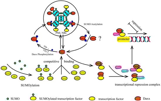 Gene expression regulation is a complex process involving intricate interactions among proteins, chromatin, histones, and chromatin-modifying enzymes. Daxx (death domain-associated protein), a multifunctional protein, plays a pivotal role in transcriptional regulation, histone modification, cell cycle control, and chromatin repair [,,]. As one of the proteins interacting with SUMO (Small Ubiquitin-like Modifier), Daxx contributes significantly to transcriptional repression []. SUMO is a small ubiquitin-like protein modifier involved in the regulation of gene expression [,]. Human gene expression is regulated by over 2000 transcription factors [,]. Moreover, the majority of repression domain sequences in these regulators contain SUMOylation sites, concise interaction motifs for recruiting corepressors, or structured binding domains for recruiting additional repressive proteins []. With few exceptions, SUMOylation of transcription factors are typically associated with transcriptional repression, achieved by promoting interactions with corepressors such as Daxx or by recruiting histone deacetylases [,,]. Daxx, functioning as a transcriptional corepressor, interacts with SUMO-modified transcription factors via its SUMO interaction motifs (SIMs), thereby facilitating the assembly of transcriptional repression complexes. Furthermore, Daxx is a constitutive component of promyelocytic leukemia nuclear bodies (PML NBs), in which it interacts with PML. Multiple studies have suggested that PML NBs act as “storage depots” for Daxx, modulating its activity as a transcriptional corepressor []. Specifically, the sequestration of Daxx within PML NBs restrict its availability for repressing transcription, whereas its release from these depots enables it to exert its co-repressive functions. This dual regulation underscores the critical role of PML NBs in modulating the dynamic activity of Daxx in transcriptional repression. SUMO, a significant component protein of PML NBs, not only participates in the formation of PML NBs but also regulates the release of Daxx from PML NBs. In this review, we elucidated the structural basis of the interaction between SUMO and Daxx, emphasizing their synergistic roles in transcriptional repression. Furthermore, we discussed a potential mechanism through which Daxx exerts its repressive effects: post-translational modifications (PTMs), particularly SUMOylation and acetylation, dynamically regulate Daxx activity within PML NBs to regulate transcriptional repression.