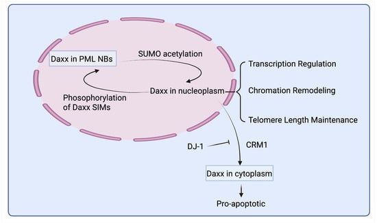 Daxx exhibits a dynamic subcellular distribution, shuttling between the nucleus and cytoplasm, as described in Figure 7, which is crucial for its diverse functions. In most cell types, Daxx is predominantly found within the nucleus. A significant portion of nuclear Daxx is concentrated in PML-NBs [,,,]. These dynamic, subnuclear structures are involved in a multitude of cellular processes, including transcriptional regulation, apoptosis, DNA repair, and antiviral responses. The SUMO-specific protease SENP1 promotes the release of Daxx from PML-NBs []. Beyond PML-NBs, Daxx is also distributed throughout the nucleoplasm and directly associates with chromatin. This localization is consistent with its established roles as a transcriptional coregulator and a histone chaperone involved in chromatin remodeling.