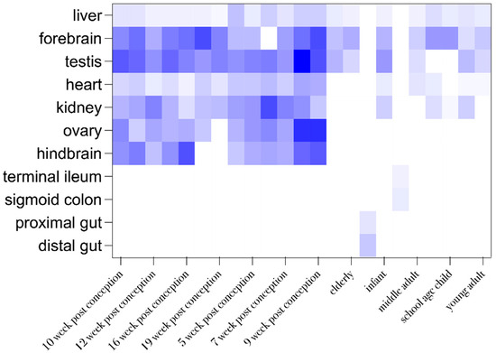 LZTR1 is a tumor suppressor gene that encodes the leucine zipper-like post-translational regulator (LZTR1) protein which belongs to BTB-Kelch superfamily [17]. LZTR1 is a Golgi protein reported to be involved in apoptosis [18]. According to the data available in UniProt, the LZTR1 protein (Q8N653) indirectly regulates the ubiquitination of Ras family proteins. Hence, this protein plays a role of negative regulator of Ras/KRAS, N-RAS and H-RAS proteins, because of the extenuation of Ras/MAPK signaling [19]. Functionally active LZTR1 protein forms a complex with cullin-3 ubiquitin ligase complex (CUL3), which then promotes the ubiquitination of Ras proteins [20]. Six beta-sheet blades or repeats form Kelch’s domain, which is located on the N-terminus and two BTB-domains separated by BACK domains on C-terminus of LZTR1 [21]. BTB domains have a conservative structure, and they could interact in homodimerization. Besides involvement in the incorporation into Golgi apparatus, BTB domains possibly play a significant role during LZTR1-E3-CUL3 complex formation and its stabilization [20]. Kelch domains are responsible for substrate binding and regulating E3 activity [22]. These domains have the ability to bind different cellular proteins. This indicates the possible involvement of Kelch proteins in the development of different diseases [23,24]. During prenatal development, the LZTR1 protein is expressed in the lung, liver, kidney, brain, and heart. The tissue-specific expression of LZTR1 protein depends on the developmental stage (Figure 2). In adults, this protein is present mainly in vessels and the immune system [17,19]. According to the transcriptomic Expression Atlas, there is no significant LZTR1 protein expression in the breast. However, LZTR1 expression on a transcriptomic level was confirmed in patients (both sexes) with breast cancer, but its status was described as not significant in disease pathogenesis because of its insignificant frequency in the study population. Additional information in the Expression Atlas for studies on different cell lines and cell types revealed the medium range expression of LZTR1 on transcriptomic and proteomic levels for selected malignant and normal cell lines [25].