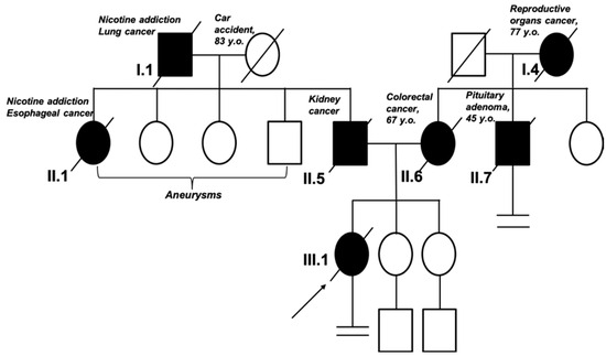 Pedigree of the patient’s family. The arrow indicates the proband. According to the family history, in the first generation, the grandfather of the proband in the paternal line died of lung cancer. In the second generation, the father of the proband and his sister (the proband’s aunt) were diagnosed with cancer; the siblings were also diagnosed with aneurysm. In the first generation in the maternal line, there was no evidence of cancer. In the second generation, the proband’s mother and uncle were diagnosed with cancer at a young age (<50 y/o).