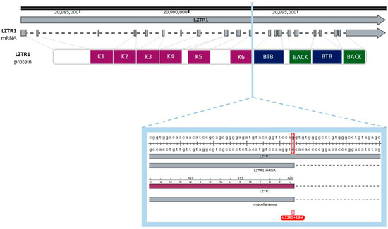 The LZTR1 gene is located on chromosome 22q11.21. The open reading frame (ORF) includes 21 exons. The gene includes misc_features sequences which could play a significant regulatory role. One of the misc_features sequences is defined as lymphoblastoid silent region and was described as a silencer of GM12878 lymphoblastic cells [27,28]. The biological impact of others is not described. The total number of misc_feature regions in the LZTR1 gene is seven. One of the described regions overlaps with the mutation site in exon no 11. According to gnomAD, the c.1260+1del variant was described in three Europeans (non-Finnish), two males and one female. This variant was described in terms of genomic and transcriptomic levels. The deletion of the single nucleotide results in frameshift mutation with high probability of loss of function (LoF), but it was not specified as a splice site mutation according to gnomAD data (accessed on 6 March 2025). There is no phenotype description for LZTR1: c.1260+1del variant. The graphical presentation of the analyzed variant is presented in Figure 4.