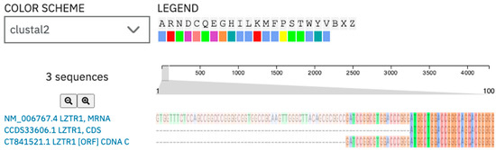In the subsequent stage we examined possible transcript and protein structures. It is noteworthy that the mutation is related to the deletion of the last nucleotide in the exon, which may result in splicing impairment. The 1260 position in mRNA was different from the position described in gnomAD. To find the reason for the position variance, we compared both sequences in the Clustul Omega alignment tool. (v1.2.4.) The result showed sequence similarity in whole length of the ccds sequence for the LZTR1 gene and this is presented in Figure 5. The consensus coding sequence was predicted with a higher prediction grade of protein-coding sequences and is currently integrated into the main datasets [29,30].