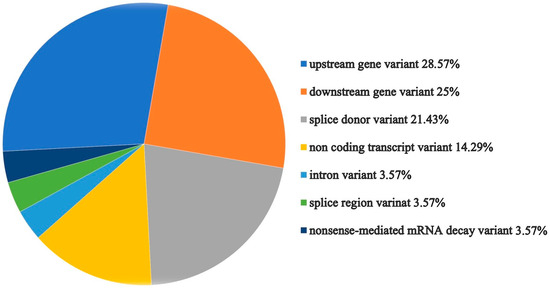 As a result of the analysis by the Variant Effect Predictor tool from Expasy, the majority of transcripts were classified as upstream gene variant, downstream gene variant, or splice donor variant (Figure 6).