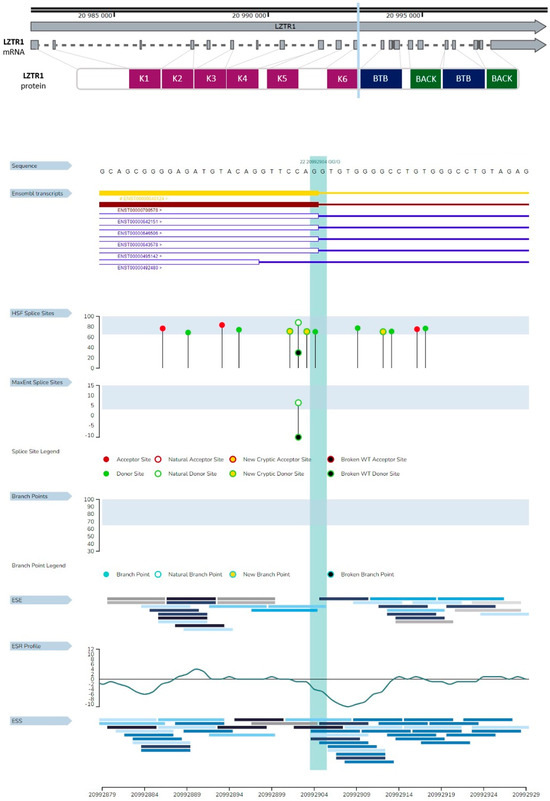 HSF GenOmnis analysis of LZTR1 c.1260+1del revealed three new cryptic donor sites. The deletion does not span the natural donor site of splicing (Figure 7). These results suggest few possibilities of gene transcript formation, outlined as follows: the possibility of frameshift or selection of one of the new cryptic donor sites during splicing. Analysis by MutationTaster revealed splice site changes and frameshift. The prediction of frameshift is similar to the HSF GenOmnis results (Table 1). Variant examination by SpliceAI confirmed the loss of a donor splicing site and the gain of a new donor splicing site. Results from the SpliceAI analysis are available at the link (https://spliceailookup.broadinstitute.org/#variant=chr22-20992903-AG-A&hg=38&bc=basic&distance=500&mask=0&ra=0) (accessed on 12 March 2025) [32].