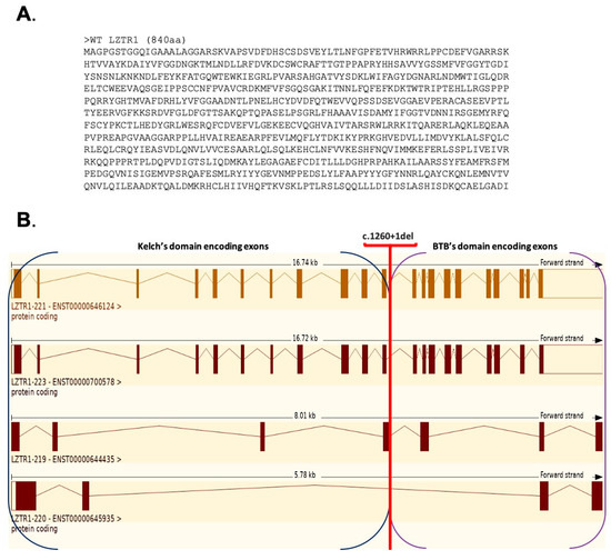 (A) Amino acid sequence for the WT LZTR1 protein (840 aa, transcript variant LZTR1-221). (B) Graphical comparison of 4/21 protein coding transcript variants for LZTR1 gene.
