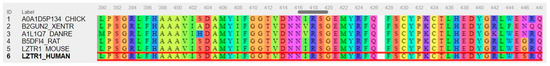 Alignment of multispecies amino acid sequence of leucine zipper-like post-translational regulator 1 (LZTR1). The presented amino acid region represents the spot of the mutation in the analyzed variant. The human LZTR1 protein is marked in the red box. The figure was created using PipeAlign2.