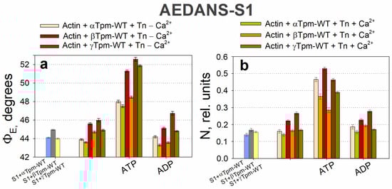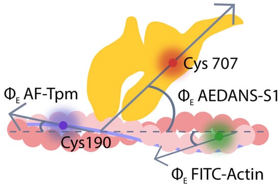 According to Figure 2, S1 binding to F-actin (AM stage), led to decreased ΦE value for AF–Tpm; the ε value decreased for the β-tropomyosin and increased for the α- and γ-tropomyosins at high Ca2+ levels. For FITC-actin, the ΦE value increased; the ε value increased in the presence of the α- and β-tropomyosins and decreased in the presence of γ-tropomyosin. These changes in ΦE values suggest that the emission dipoles of FITC-phalloidin on actin and AF on tropomyosin move in opposite directions—toward and away from the center of the thin filament, respectively.
