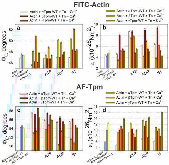 The dependence of fluorescence parameters for FITC-actin, AF-Tpm, and AEDANS–S1 on Ca2+ levels has previously been observed, regardless of the tropomyosin isoform (α, β, or γ) incorporated into thin filaments [,,,,]. Since FITC-phalloidin binds strongly and specifically to F-actin [], the changes in ΦE and ε values reflect, respectively, the spatial rearrangements of actin monomers within the actin filament and alterations in their bending stiffness [,,]. The location of the FITC label allows for the observation of conformational changes at the level of the actin double helix. The F-actin filament is organized as a right-handed double helix made up of two single left-handed filaments. It has been shown that the increase in intrinsic twisting or overtwisting of F-actin occurs in a clockwise direction, while untwisting happens counterclockwise [,]. Similarly, as AF specifically binds to the Cys residues of tropomyosin, the changes in ΦE and ε values reflect both the spatial rearrangement and the changes in bending stiffness of tropomyosin strands [].