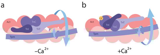 A schematic representation of conformational changes in the helical structures of actin and tropomyosin induced by troponin and calcium ions. (a) Arrows indicate the direction of actin twisting and tropomyosin untwisting at low Ca2+ levels. (b) Upon Ca2+ binding to troponin, arrows indicate actin untwisting and tropomyosin twisting. All structural transitions shown in the figure are schematic and not drawn to scale.