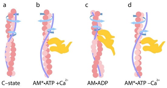 Significant progress has been made in elucidating the changes in the myosin motor that occur prior to its dissociation from actin in the presence of ATP, as well as the subsequent conformational changes, known as the recovery stroke, which facilitate ATP hydrolysis. After ATP hydrolysis, the myosin motor enters a pre-power stroke state where it is prepared to produce force and move along actin, with MgADP and Pi being trapped inside the motor. The myosin head contains all of the necessary components for force and movement generation []. Notably, transitions between weak and strong binding states are accompanied by enhanced intramolecular movements, not only in myosin, but also in actin. Actin-related regulation is carried out by the actin-binding protein complex tropomyosin–troponin (Tpm–Tn), which is sensitive to changes in intracellular Ca2+ concentration. At low Ca2+ concentrations, the C-terminal domain of the inhibitory subunit of troponin (TnI) attracts tropomyosin, causing it to bend and then pivot towards the TnI []. This “blocked” position of tropomyosin results in steric hindrance, preventing the binding of myosin to actin and inhibiting the cross-bridge cycle during contraction. Recent studies have shown that tropomyosin can pivot relative to fixed points on actin, accompanying structural transitions from the blocked (B) to the closed (C) state []. This transition is activated by an increase in Ca2+ concentration, leading to the displacement of the inhibitory C-terminal domain of TnI from the actin–tropomyosin complex []. Changes in the binding of TnI to actin are accompanied by the shift of tropomyosin approximately 15 degrees to a closed position, which eliminates steric hindrance and enables the weak binding of myosin heads to the actin surface, now partially exposed [,,,,]. The isomerization of myosin heads into a strong complex with actin causes the further movement of tropomyosin by approximately 25 degrees into an open position. This configuration of tropomyosin enables neighboring myosin heads to bind, fully activating the thin filament [,].