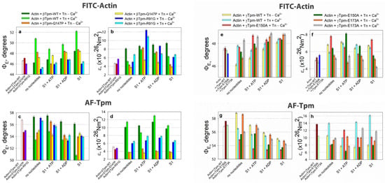 The binding of S1 to the F-actin–Tpm–Tn complex significantly affected the polarized fluorescence parameters of FITC–Actin and AF–Tpm, depending on the Ca2+ levels and regardless of nucleotides presence. AEDANS–S1 also underwent conformational changes upon Ca2+ and nucleotide binding. In control experiments lacking troponin and S1, Ca2+ and nucleotides had no noticeable impact on FITC-actin or AF-Tpm fluorescence. These findings suggest that the observed changes primarily reflect S1- and Ca2+-dependent conformational rearrangements in F-actin and tropomyosin under various ATPase cycle stages [].