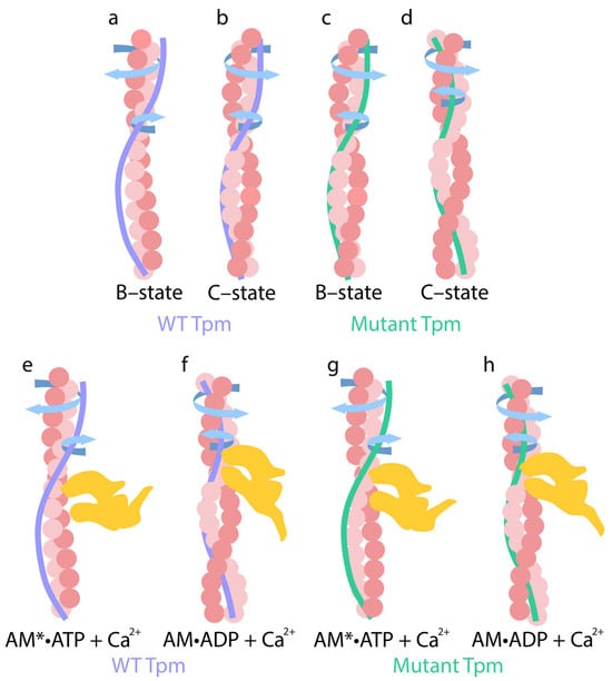 Schematic view of coiling changes in actin and WT (a,b,e,f) and mutant (c,d,g,h) tropomyosin in the presence of troponin, calcium ions, and nucleotides (ATP, ADP). (a,c) At low Ca2+ concentrations, arrows indicate the direction of actin filament twisting and tropomyosin untwisting. (b,d) Upon the addition of Ca2+, arrows indicate the direction of actin untwisting and tropomyosin twisting. These conformations correspond to the B-state and C-state of the thin filaments, respectively. (e) In the AM*•ATP stage, weakly bound myosin heads deviate from F-actin, actin filaments become overtwisted, and their stiffness increases. At the same time, tropomyosin strands become more flexible and untwisted. (f) In the AM•ADP stage, myosin heads are inclined to the actin filament and strongly attach to thin filaments, and actin filaments undergo sharp untwisting, accompanied by a significant reduction in their bending stiffness. In contrast, tropomyosin strands twist and become stiffer. (g) In the presence of mutant tropomyosin during the AM*ATP stage, myosin heads are more tilted toward the thin filaments. Actin filaments untwist, while tropomyosin filaments twist abnormally. (h) At the AM•ADP stage with mutant tropomyosin, myosin heads deviate from the thin filaments. The extent of actin untwisting and tropomyosin twisting is reduced. These changes are accompanied by an increase in actin filament’s stiffness and a decrease in tropomyosin’s stiffness. The extent of these changes correlates with the level of myosin ATPase activity. All structural transitions shown in the figure are schematic and are not drawn to scale.