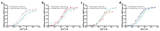 Effects of increasing Ca2+ concentration on the actin-activated ATPase activity of S1. Calcium dependence was measured for fully reconstituted thin filaments containing either Tpm–WT or the following mutant variants: Tpm–E173A (a), Tpm–R90P (b), Tpm–Q147P (c), Tpm–E150A (d). Representative ATPase activity curves are shown. Average pCa50 values from three to four independent experiments are presented; error bars indicate SEM. The shift in the ATPase activity curve to the left indicates the high calcium sensitivity of S1 in the presence of mutant tropomyosins (E173A, R90P, E150), whereas the right shift points to decreased calcium sensitivity in the presence of Tpm-Q147P.