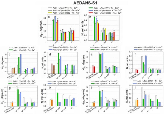 To investigate how the binding of the tropomyosin–troponin complex to actin, the presence of Ca2+ ions, and point substitutions in α-, β-, or γ-tropomyosin affect the conformational state of F-actin, tropomyosin, and myosin heads, polarized fluorimetry was employed [,,]. The polarized fluorescence of the analyzed proteins reflects the average structural state of the population of protein molecules [,,,]. The AM stage of the actomyosin complex was simulated in the absence of nucleotides. Mg–adenosine diphosphate (MgADP) and Mg–adenosine triphosphate (MgATP) were used to mimic the AM•ADP, and AM*•ATP stages, respectively [,,].