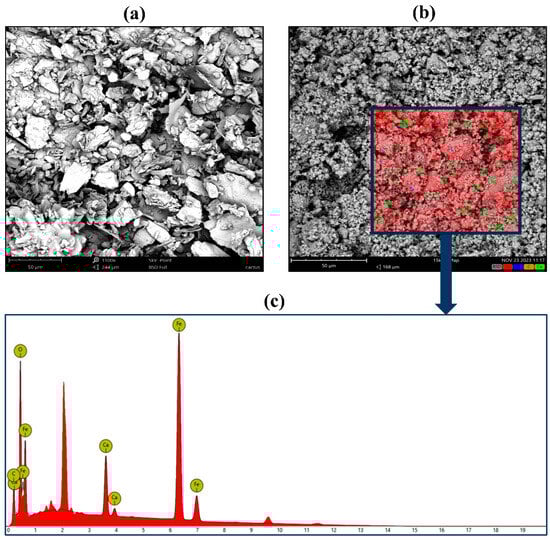 Scanning Electron Microscopy combined with Energy Dispersive X-ray Spectroscopy (SEM-EDX) was used to visualize and determine the morphological features and elemental distribution within the nanocomposite. This analysis was performed using a Phenom ProX microscope (Phenom-World BV, Eindhoven, The Netherlands), which operates in high-vacuum mode. The EDX detector integrated with the SEM allowed for elemental analysis to confirm the presence of iron (Fe) and other constituent elements in the nanocomposite.