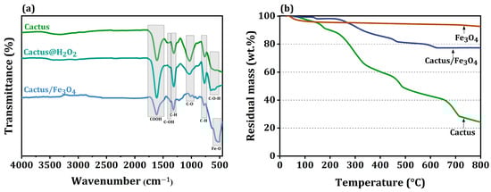 (a) FTIR spectra of raw cactus, H2O2-modified cactus, and cactus/iron oxide nanocomposite material; (b) TGA profiles of cactus, iron oxide, and cactus/iron oxide nanocomposite.