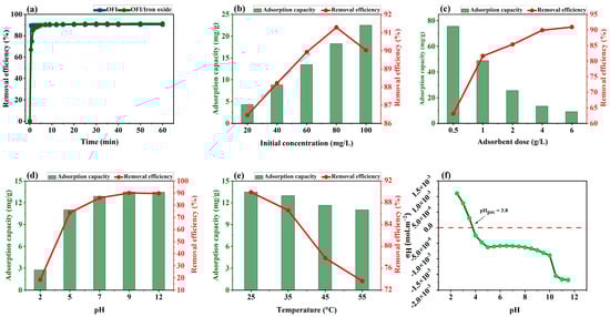 (a) Removal efficiency over time for OFI and OFI/iron oxide. Effects of (b) initial concentration, (c) adsorbent dose, (d) pH, (e) temperature on OFI/iron oxide, and (f) proton surface charge vs. pH for cactus/iron oxide.