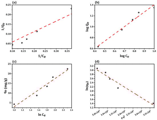 Linear plots of (a) Langmuir, (b) Freundlich, (c) Temkin and (d) Dubinin–Radushkevich adsorption isotherm models.