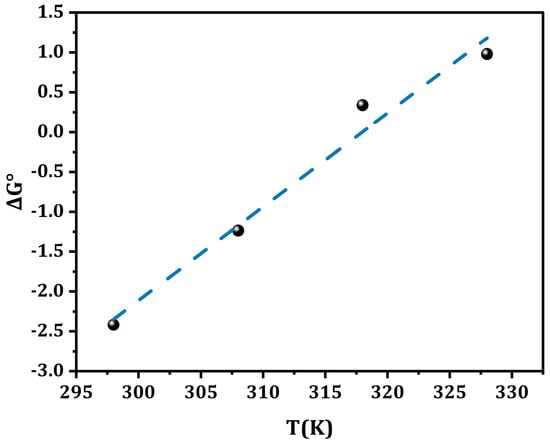 The graph of ΔG° vs. temperature (T), shown in Figure 5, provides further insight into the thermodynamic parameters. The slope of the plot yields ΔS°, and the intercept gives ΔH°. From the evaluation of the slope and intercept, the values of ΔS° and ΔH° were found to be −0.118 kJ/mol K and −37.61 kJ/mol respectively.