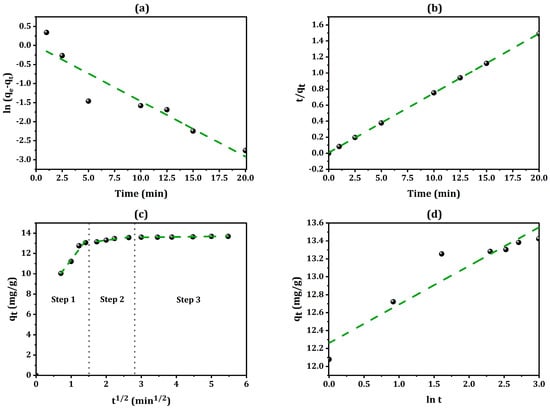 Linear plotting of (a) pseudo-first-order, (b) pseudo-second-order, (c) intraparticle diffusion, and (d) Elovich adsorption kinetic models.