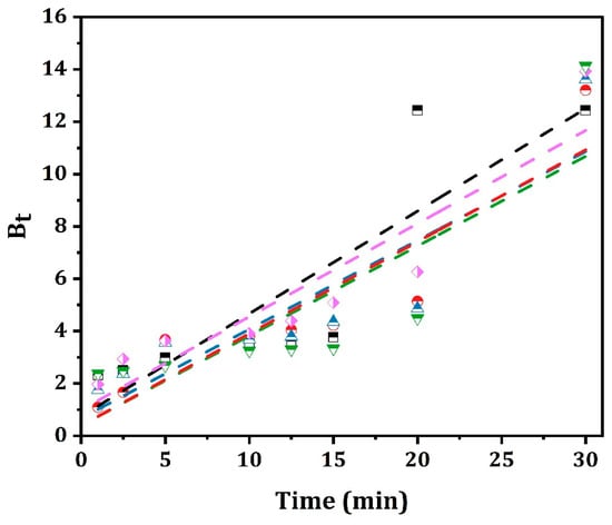 The Boyd plot, which represents Bt against time t, can help determine the rate-controlling step of the adsorption (Figure 7). If the plot produces a straight line passing through the origin, it suggests that pore diffusion is the limiting step. On the other hand, if the plot does not pass through the origin, film diffusion or external mass transport is likely the controlling factor [].
