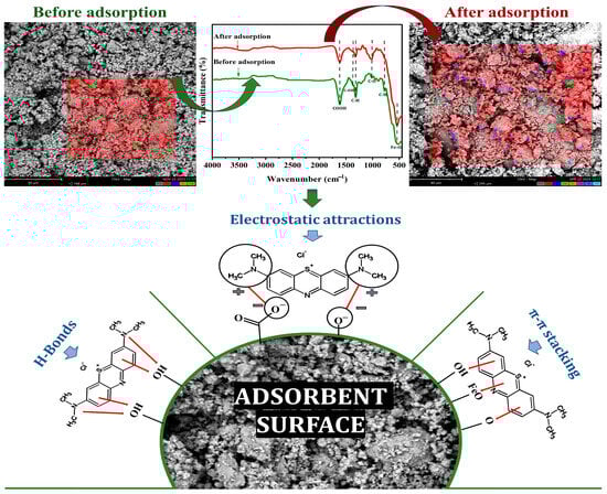 The involvement of these functional groups is supported by a decrease in the intensity of the OH stretching band in the 3200–3600 cm−1 range, the C=O carbonyl stretching at 1728 cm−1, and the C=O band at 1110 cm−1, all of which suggest that the –OH and C=O groups play a key role in the adsorption process. Additionally, the amino groups in the MB dye molecules form dipole–dipole hydrogen bonds with the –OH and –COOH groups on the cactus surface []. Furthermore, the benzene rings of the MB molecules may interact with the hydrogen atoms on the cactus surface through Yoshida H-bonds. The iron oxide nanoparticles, containing numerous vacant O2− sites around Fe2+ and Fe3+ ions, also contribute to the adsorption by interacting with the positive charges of the MB dye [].