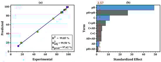 (a) Scatter plot of predicted vs. experimental MB removal; (b) Pareto chart of the standardized effects of pH, initial concentration, and adsorbent dose.