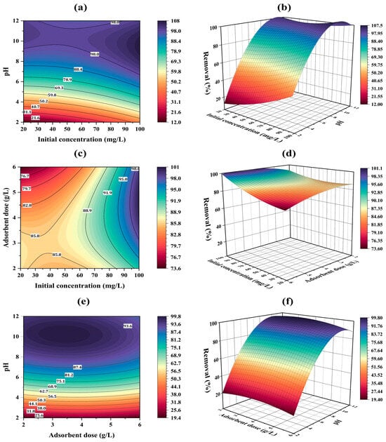 Figure 10 illustrates the interactive effects of each pair of parameters on dye removal efficiency, while keeping other parameters constant. The curvature of the contours and three-dimensional plots provides a detailed insight into the analyzed factors and their interactions.