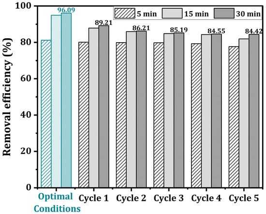 The reusability study of the nanocomposite material was conducted under optimal conditions over five adsorption–desorption cycles. After each adsorption cycle, the composite was treated with 50% v/v ethanol. The desorbed adsorbent was then washed three times with distilled water to ensure complete removal of the MB dye from its surface, after which it was dried at 80 °C for 6 h before being reused.