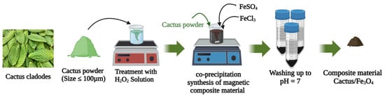 Cactus is a widely cultivated natural product found in arid and desert areas around the world. It is abundant and can be propagated in many different environments globally. Estimates reveal that the exploitation of one hectare of cactus can generate up to 20 tons of dry powder per year []. Mexico is considered the only country where cactus cladodes (flat, oval-shaped leaves) are cultivated for commercial purposes, although they remain underutilized in other regions []. In addition to their use in food and animal feed in some parts of the world, cactus cladodes have demonstrated effectiveness as eco-friendly materials for wastewater treatment, serving as biosorbents, biocoagulants, and bioflocculants in the pharmaceutical and traditional medicine industries [,].